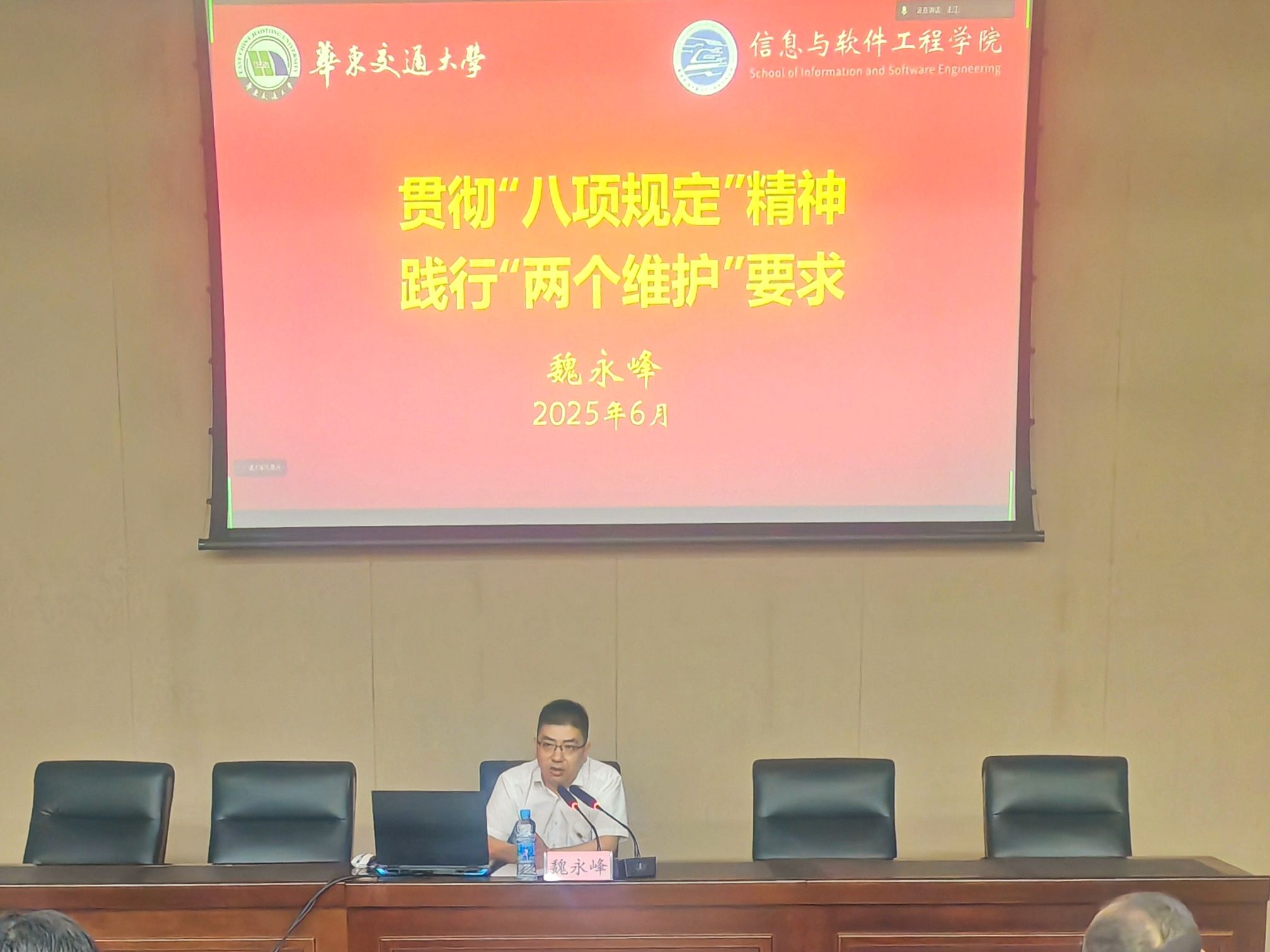 魏永峰书记以“贯彻‘八项规定’精神,践行‘两个维护’要求”为主题讲授专题党课。党课从历史沿革、理论内涵、实践要求三个维度,系统阐释了“八项规定”与“两个维护”的内在联系。魏永峰首先回顾了中央八项规定出台的历史背景和十二年来的实践成效,通过典型案例深入剖析了“四风”问题的表现形式和危害。他强调,“两个维护”是共产党员必须坚守的最高政治原则和根本政治规矩,要求毕业生党员在今后工作生活中:一要筑牢政治忠诚,做“两个维护”的坚定践行者;二要永葆为民初心,当好人民的“学生、公仆、勤务员”;三要严守纪律底线,自觉抵制形式主义、官僚主义等不良风气。这堂党课既是对毕业生党员的临行嘱托,也是一次深刻的思想政治教育,为即将踏上新征程的党员同志指明了政治方向和行为准则。