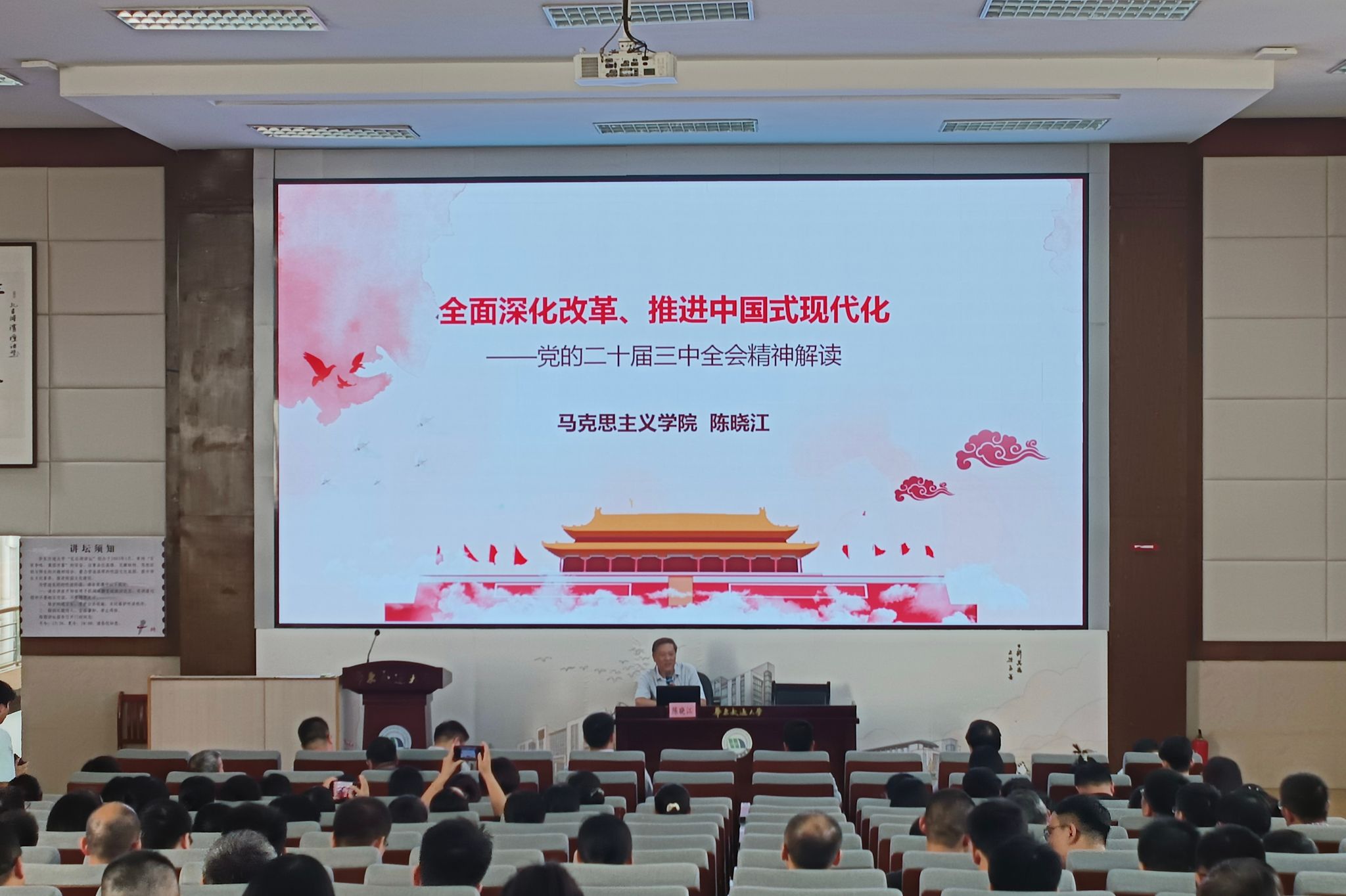 陈晓江以《全面深化改革、推进中国式现代》为题,从历届三中全会的重要性讲起,介绍了会议召开背景、全会总体概况,紧紧围绕党的二十届三中全会上的公报和全会审议通过的《中共中央关于进一步全面深化改革、推进中国式现代化的决定》以及习近平总书记关于《决定》的说明,用生动的语言和丰富的案例,对党的二十届三中全会精神学习进行了系统辅导。