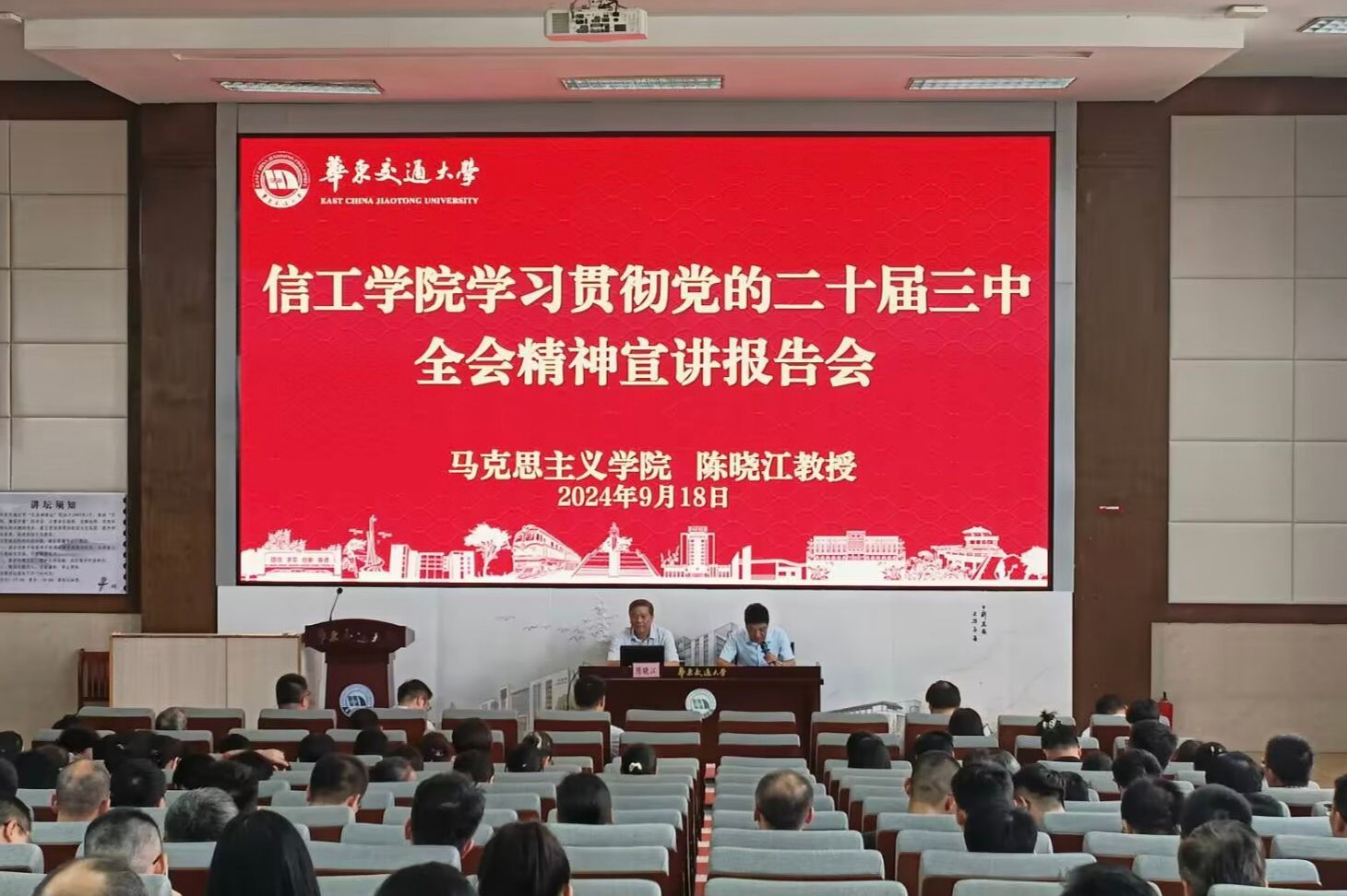 9月18日,信工学院学习贯彻党的二十届三中全会精神宣讲报告会在南区图书馆202孔目湖讲坛举行。校宣讲团成员、马克思主义学院陈晓江教授应邀作宣讲。学院党委书记魏永峰主持会议,学院领导班子成员、全体教职工参加会议。