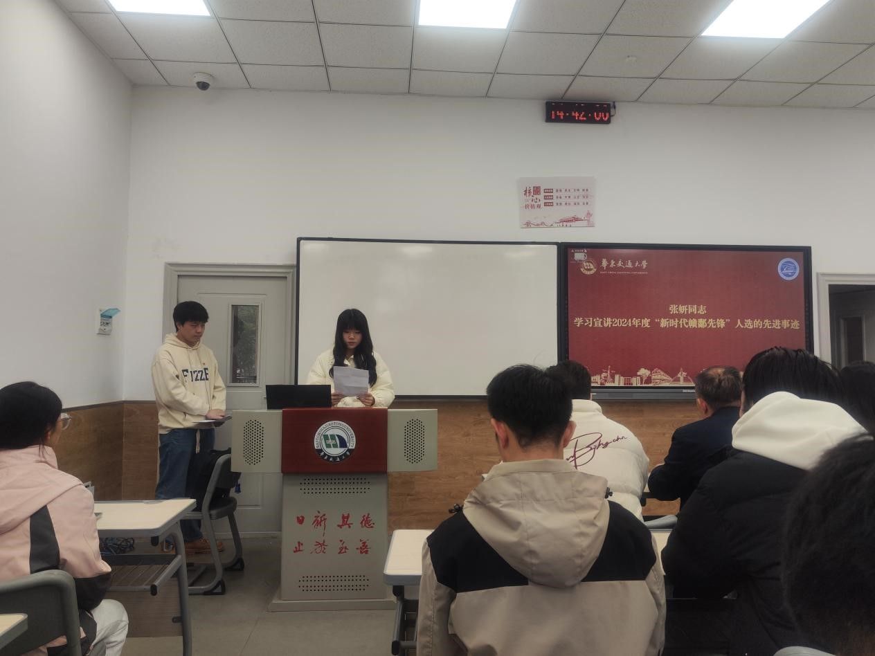 会议伊始,由张妍同志带领大家学习我校“新时代赣鄱先锋”陈莹莹、蔡智超、刘亮亮、丁孺琦的先进事迹。号召党员干部以这些先进典型为榜样,树立正确的世界观、人生观、价值观,为实现中华民族伟大复兴中国梦贡献一份力量。
