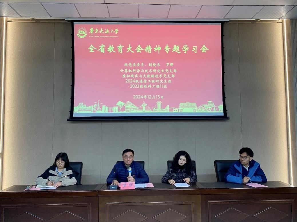 计算机科学与研究生党支部、虚拟现实与大数据技术学生党支部在院校友报告厅举办学习全省教育大会精神专题会议,院党委委员、副院长罗晖出席并讲话,计算机科学与研究生党支部全体党员、虚拟现实与大数据技术党支部全体党员、2024级通信工程研究生班全体同学、2023级软件工程11班全体同学参会,会议由虚拟现实与大数据技术党支部书记郭招男主持。