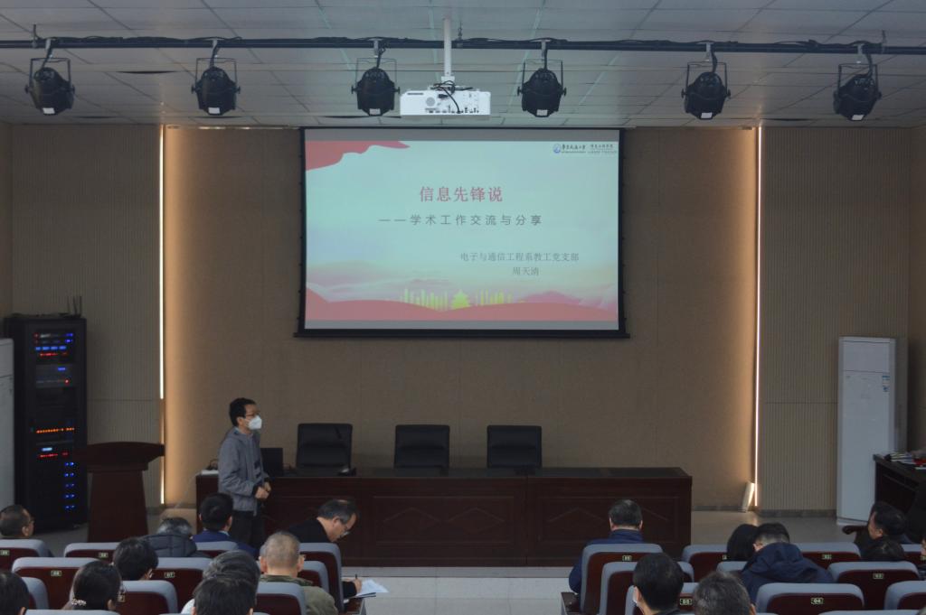 3月23日,信息工程学院在校友学术报告厅举办信息先锋说——学术工作分享交流会。电子与通信工程系教工党支部周天清同志以科研写作为主题作分享交流,学院全体教工党员参加会议。
