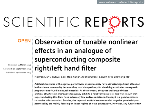 10月7日,我校信息学院射频通信与传感器网络江西省重点实验室,在高温超导超材料非线性效应研究领域的一项重要研究成果,被英国Nature出版集团《ScientificReports》期刊在线发表,论文题目是《Observationoftunablenonlineareffectsinananalogueofsuperconductingcompositeright/lefthandfilter》。我校副校长刘海文教授,信息学院官雪辉博士和日本埼玉大学马哲旺教授,天津海泰超导公司季来运研究员是本篇论文的共同通讯作者,硕士生雷久淮和蒋浩是本论文的学生作者,拉斯维加斯