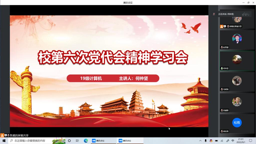 为让学院广大团员青年了解校第六次党代会精神,充分认识到学习宣传贯彻到学校第六次党代会的重大意义,信息学院党委副书记兼2019级计算机专业辅导员何仲坚同志于9月1日晚召开校第六次党代会精神学习会,2019级计算机专业全体学生与会。