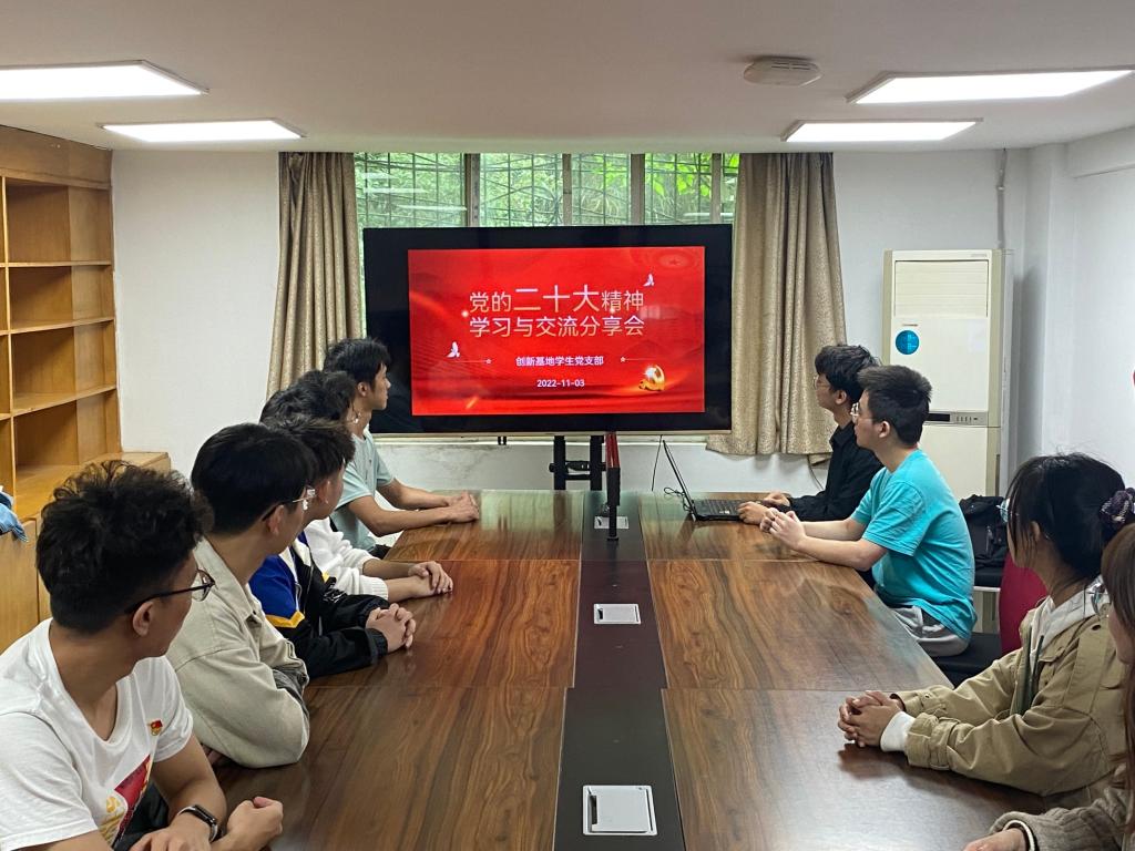 11月3日,创新基地学生党支部在“三化”平台开展了“学习贯彻党的二十大精神”以及“重温入党誓词”等一系列活动,支部学生党员参加此次学习分享会。