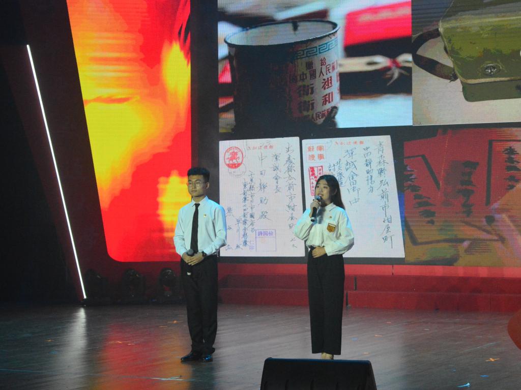 信息学院以“红肚兜”为引讲述杨荣显一家八子,满门忠烈的英雄事迹,进而讴歌从古至今无数共产党人身上不怕牺牲、无私奉献的精神。故事中,母亲在儿子参军前送的红肚兜,一针一线所含的不仅是对孩子的牵挂,更是对党和红军战士的拥护,是对幸福安定的期待。演讲过程中,母亲对儿子的思念,儿子战场赴死姿态,演员表现地十分细致,观众为之动容。演讲者声声透露真情,最后一句呐喊“中国有我”,与观众形成互动,赢得热烈的掌声。