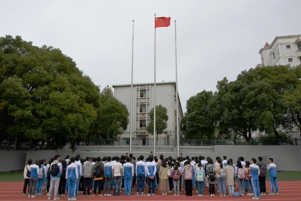 国旗在师生的注视中飘扬而上,国护队以军礼给予国旗崇高敬意。全场肃穆站立,高唱国歌。