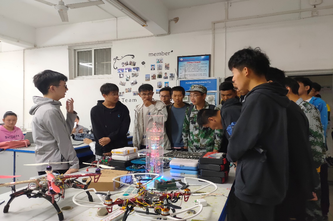 计算机创新基地,负责人罗开流为同学们讲解了常用芯片和单片机的基本功能、以及无人机的基本知识,使同学们对硬件知识有了初步的了解;通信电子创新基地,讲解人何勇从硬件和软件两方面介绍了实验室的研究方向,通过简单的举例让同学们理解传感器及其他相关技术。