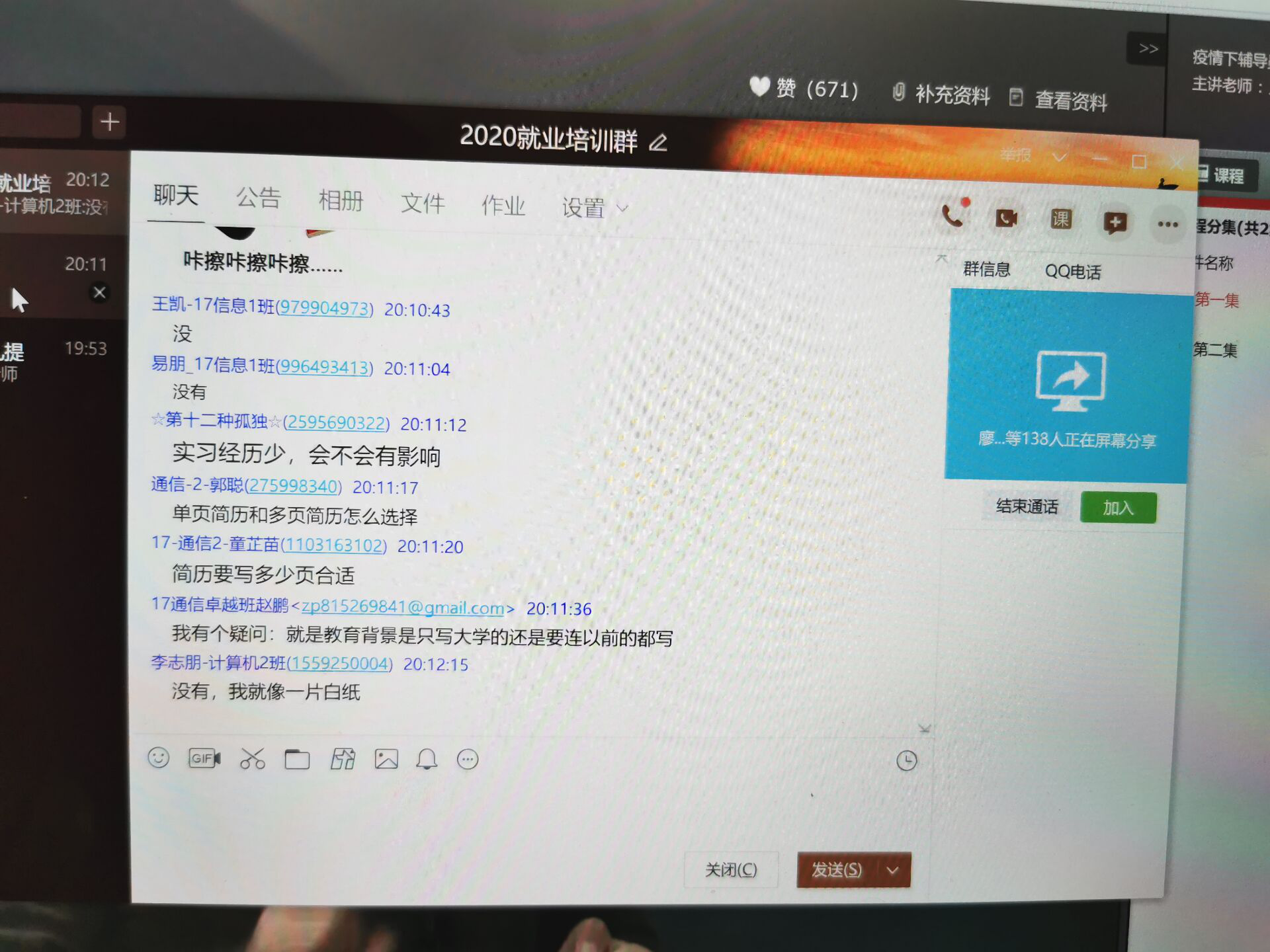 在全球疫情严峻,经济受到冲击的背景下,疫情期间的就业局势不容乐观。为促进学生优质就业,4月1日至4日,信息学院通过QQ视频形式开展线上就业指导培训班,邀请现任猎聘校园华东区高级项目经理、金牌简历顾问—廖雯雯老师担任主讲老师,200多名学生线上参与了本次培训。
