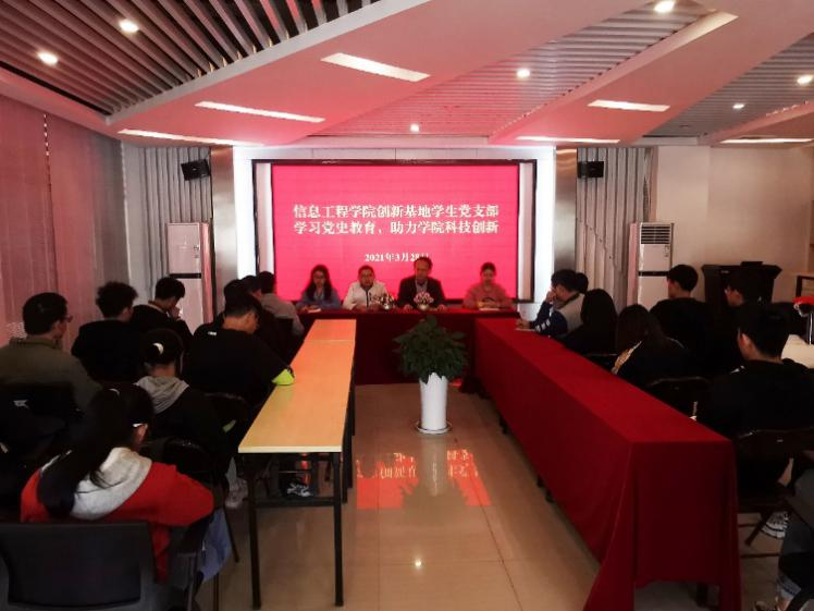 信息工程学院创新基地学生党支部3月28号下午在逸夫楼负一楼创新创业会议室召开“党史学习教育,促进学院科技创新”会议活动,院党委副书记何仲坚、创新基地学生党支部书记黄德昌和创新基地学生党支部全体学生党员参加会议。