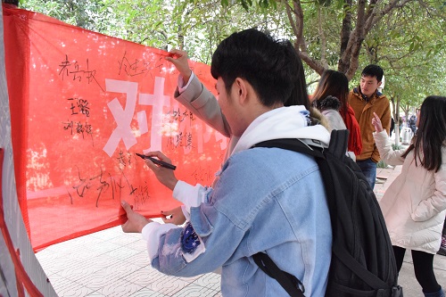 同学们在横幅上签名