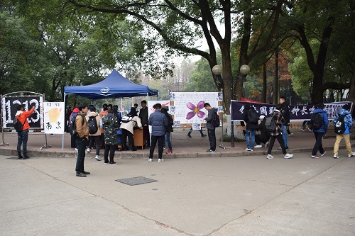 阴沉的天空下,黑白相间的海报、由千纸鹤组成“12·13”样式的展示板和书写着“勿忘国耻,警钟长鸣”的横幅引得众多路人驻足凝望。“愿和平永存,愿同胞安息”、“空一座城,追三万魂”、“珍惜如今来之不易的生活”......祈福绳上挂着的一张张祭文书签、展板上的一只只洁白纸鹤抒发着同学们对遇难同胞的哀思、对和平的珍重。