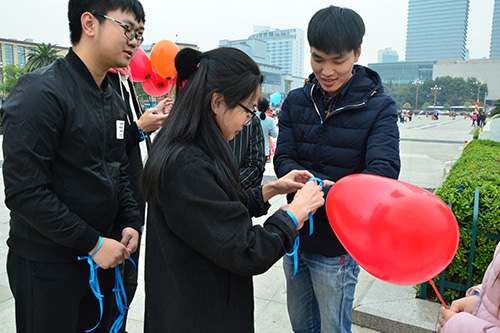 “请问你最想感恩的人是谁?”、“有没有什么让你特别想感恩的事呢?”在人流密集的八一广场上,同学们分组开始进行采访。采访过程中,有人感恩自己的父母、闺蜜、哥们,也有人感恩自己的另一半,不同的答案,寄托着不一样的感恩之情。同学们为每一个被采访的路人系上蓝丝带,送上心形气球,路人积极配合采访,热情似火,让这个有点冷的冬天变得温暖起来,八一广场上充满着感恩的气息。