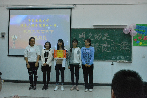 在颁奖晚会中,杨青老师首先发表了自己对活动的看法。她表示,通过大家一起整理寝室,沟通情感,每个人都要学会去维护、保持寝室的卫生,使它像家一样温馨;在和室友相处时要做到“己所不欲,勿施于人”。随后,由到场的嘉宾依次为获奖的寝室颁奖。21#2-401-1室获得了本届寝室文化艺术节的一等奖。