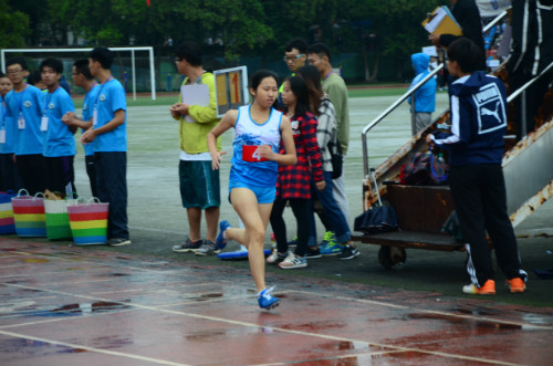 由于天气原因,跑道上不仅湿滑,并且有多处积水,但是这些都无法阻信息健儿们的激情。800米发令枪响,刘雪梅便势如破竹,以百米冲刺的速度领先全队,第一圈便与对手们拉开了近百米的距离,第二圈后半段时,面对体力的消耗殆尽,她的速度稍微下降,但此时信息学院观众席一阵又一阵的震耳欲聋的加油声完全将她的斗志点燃了,借着同学们的呐喊声,刘雪梅一鼓作气冲破终点线,以打破校运会记录的好成绩将自己的名字写在了复赛名单上。