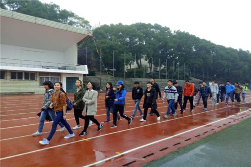 活动以班级为单位,每个班级依次出发。学生首先围绕南区田径场慢走两圈,在工作人员的指导下到达国防生操场,再绕国防生操场外围一圈。终点处会有工作人员计时,每班最后一个到达终点处的同学的成绩为最终成绩。