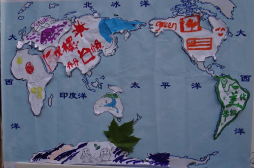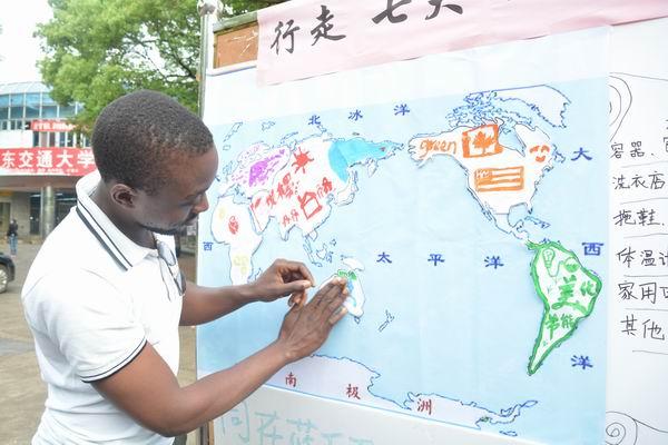 历经近两小时的奔跑,七支队伍全部返回地球村“大本营”,成功完成七彩世界地图平面图的拼凑,助力重现彩虹地球村。由来自非洲喀麦隆的该校国际学院留学生八一带领的“大洋洲队”,更是在大洋洲板块上画上一只袋鼠,还有点点绿草作陪衬,意在呼吁人类保护绿色植被,还给地球一片绿色。“This is a very meaningful trip”八一告诉记者。