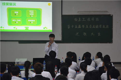 会上,学生会及团学组织共18个部门进行工作汇报总结,各部门ppt展示15-16学工作成果总结同时对部门职能、成员构成、部门展望进行阐述宣传部体育部青协心素会等部门述职中展示学院取得的新突破:校新闻评比获得第一名、校运会再创新记录夺得第三名志愿工作节节开花,服务总时长达到近一万小时心理剧大赛摘得亚军等等