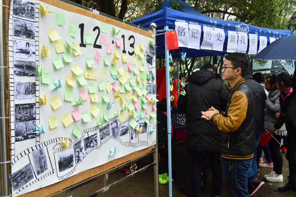 校园内循环播放南京大屠杀介绍音频,还原历史真相,该校学子认真聆听当年的血雨腥风,为遇难者默哀。道路两旁摆放着展板,“铭记历史,筑我中华,致南京”的标语十分醒目,黑白色的历史照片给人烙下深深的印记。照片上日军进行刺刀比赛、将砍下的中国人的头颅拿在手中留影、活埋中国平民等屠杀行为令人发指。工作人员介绍着照片,众多同学驻足观看,或感慨,或悲愤。“这些照片值得我们每一个人反思,少年强则中国强,我们必须担负起复兴国家的重任,不让历史重演。”该校信息学院李昌珊同学凝视着照片说道。