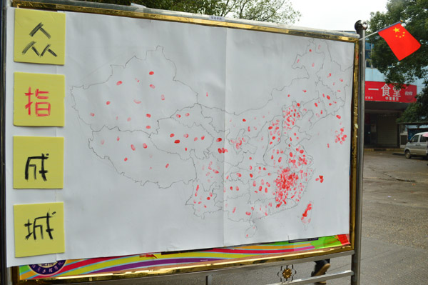 活动现场,华东交大学子们自发摁红色手印,“绘”出一面以中国地图为轮廓的红色国旗,象征中国青年将会撑起中国的一片天,以此纪念国家公祭日的到来。“红色的手印十分醒目,它提醒着我们不能忘却耻辱,忘却遇难同胞的苦难。”信息学院14级通信工程专业鄢秀松同学印上了自己的手指印,并指向南京所在位置说道。