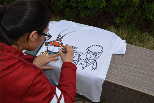 大赛现场,以团队参赛的小组成员之间积极合作分工,有的三五成群地讨论着如何布局上色的,甚至有的参赛队员为了使图画更加生动模仿起了设计的人物。以个人参赛的选手神情专注地绘制着设计的图案,不被他人所干扰。一件件纯白T恤在各个参赛选手的创意下变得色彩缤纷、各具特色。参赛选手们各显其能,创作风格各异,卡通的、抽象的、风景的…英勇的“齐天大圣”神气活现,表达了勇敢坚强的信念,憨厚可爱的国宝熊猫表现出中国的奉献传统,清新的雨后蓝图传递了一种清透舒爽的情绪...