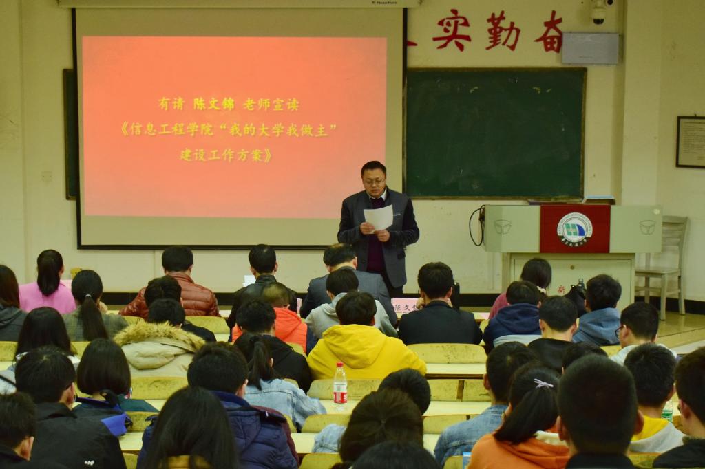 学工办主任兼团委书记陈文锦宣读了《信息工程学院“我的大学我做主”学风建设工作实施方案》,方案从7个方面对学风建设工作进行了具体部署。
