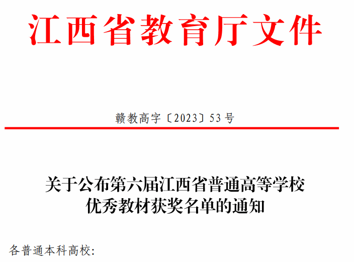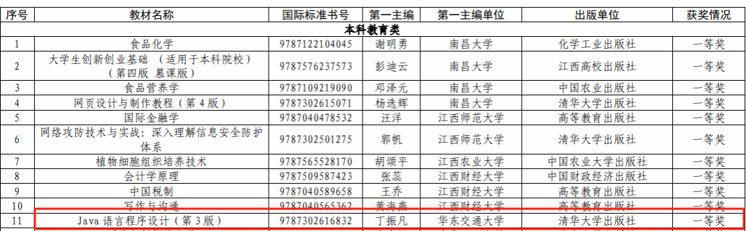 近日,江西省教育厅发布《关于公布第六届江西省普通高等学校优秀教材获奖名单的通知》(赣教高字〔2023〕53 号),公布了第六届江西省普通高等学校优秀教材获奖名单。拉斯维加斯 丁振凡教授教材《Java 语言程序设计(第 3 版)》荣获本科教育类优秀教材一等奖,特此喜报!