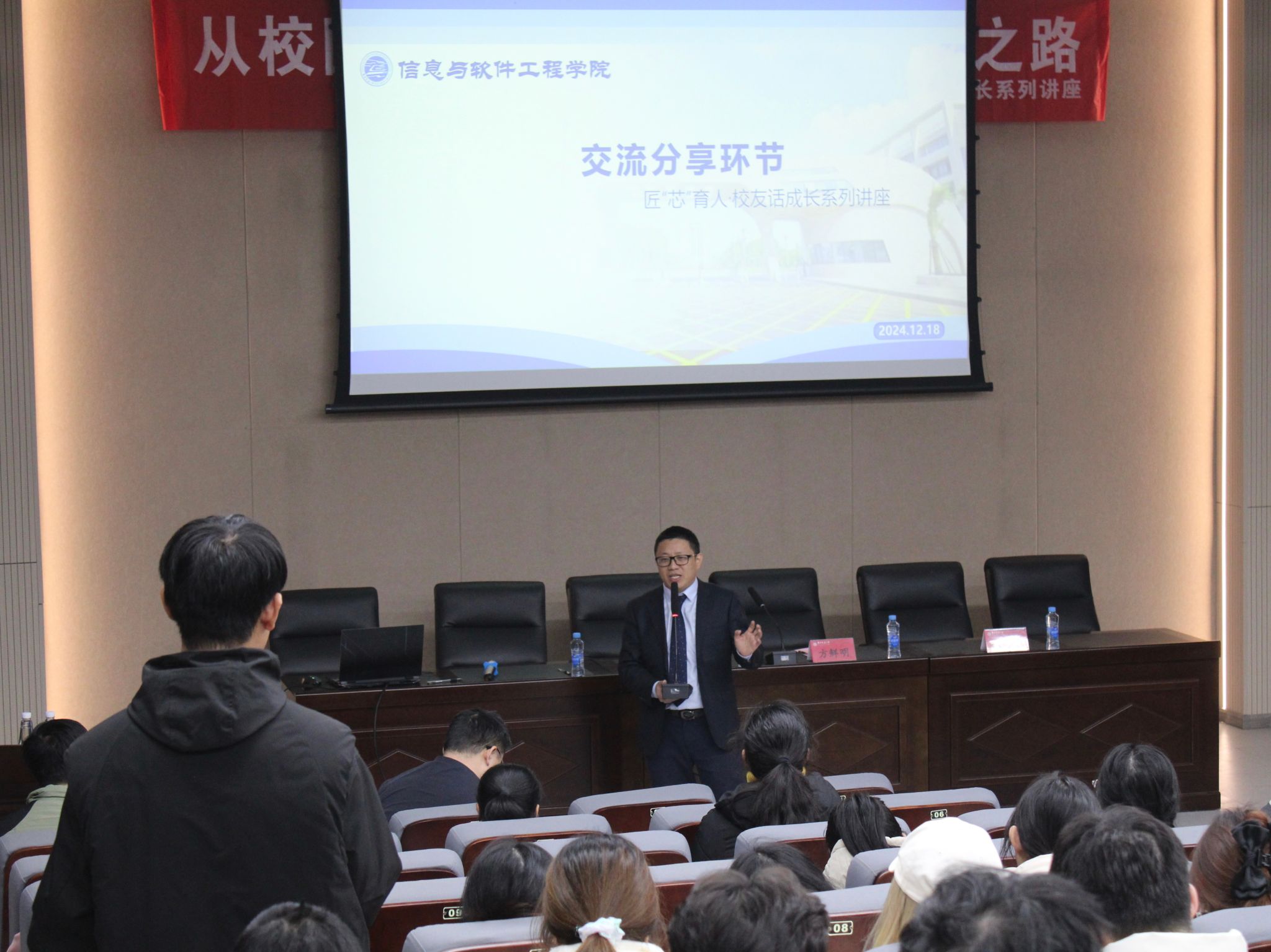 为凝聚校友力量,搭建校友与母校之间的沟通桥梁,拓宽育人途径,2024年12月18日,学院邀请优秀校友任银华、方鲜明在教4栋108校友报告厅开展“从校园到职场,雕琢卓越职业之路”主题讲座。学院党委委员、院长姜楠出席并致辞,学院辅导员兼就业干事姚雄俊主持,学院学生代表共计一百余人参加。