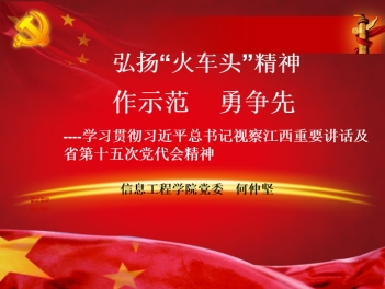习近平总书记视察江西重要讲话,是习近平新时代中国特色社会主义思想的“江西篇章”,是指引江西一切工作的总方针总纲领总遵循。何仲坚希望全体教工党员:一是在用习近平新时代中国特色社会主义思想培根铸魂上下功夫。紧紧围绕主题教育“学思想、强党性、重实践、建新功”的总要求,进一步加强对习近平新时代中国特色社会主义思想学习,真正在以学铸魂、以学增智、以学正风、以学促干方面取得实效。二是在传承好江西红色文化基因上下功夫。要坚定信念信仰,传承八一精神、井冈山精神、苏区精神等宝贵精神财富,赓续红色血脉,永葆共产党员的政治本色。三是在弘扬“火车头”精神上下功夫。要进一步发挥信息学院全国党建标杆院系的示范作用,加强“火车头”党建提升工程建设,争做“铁心铸忠诚、铁血报家国、铁肩担使命、铁手创大业”的新时代铁人铁军,营造“人人作示范,个个勇争先”的良好氛围。四是在服务江西经济社会发展上下功夫。为江西经济社会发展提供智力支持和人才保障。
