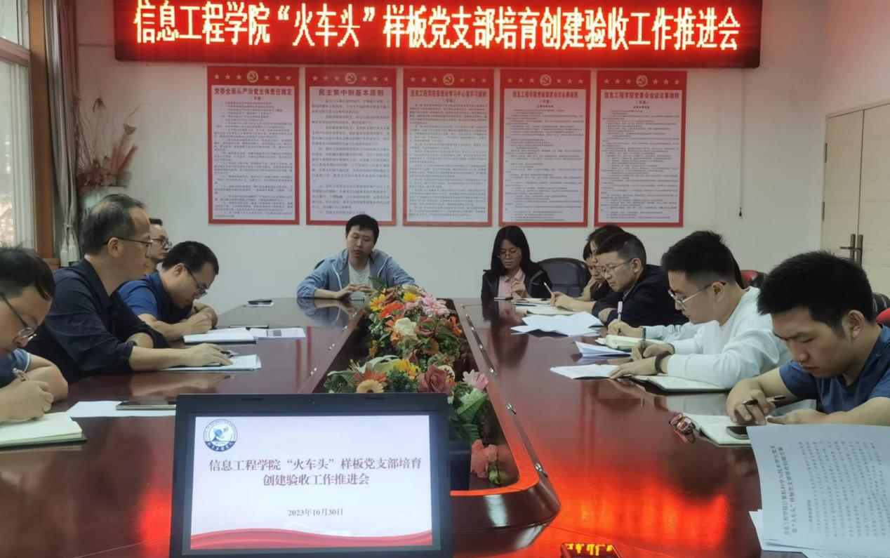 为确保学院“火车头”样板党支部培育创建验收工作按时并高质量完成,10月30日,信息工程学院党委召开“火车头”样板党支部培育创建验收工作推进会。院党委书记何仲坚主持会议并作工作部署。