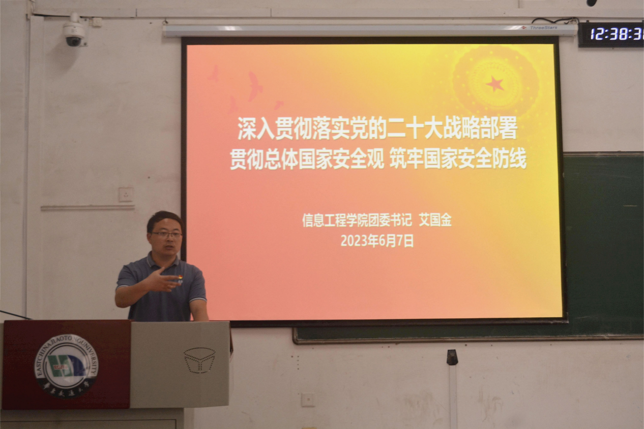 为进一步加强学生对总体国家安全观的认识,6月7日,信息学院于14栋113开展“深入贯彻落实党的二十大战略部署,贯彻总体国家安全观,筑牢国家安全防线”主题团课,院团委书记艾国金主讲。