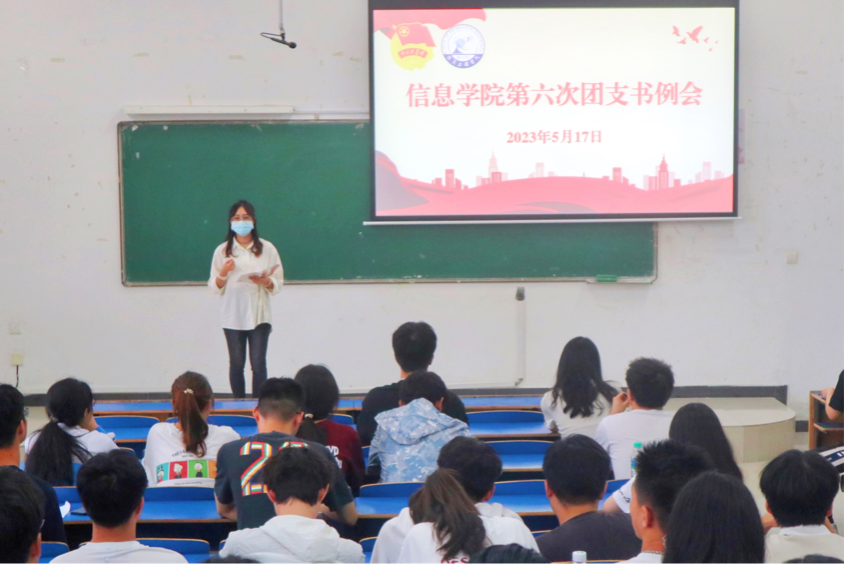为高效开展近期各项工作,加强基层团组织建设,5月17日,信息学院于逸夫楼110教室组织召开第六次团支书例会,院团委副书记李萌萌出席会议。