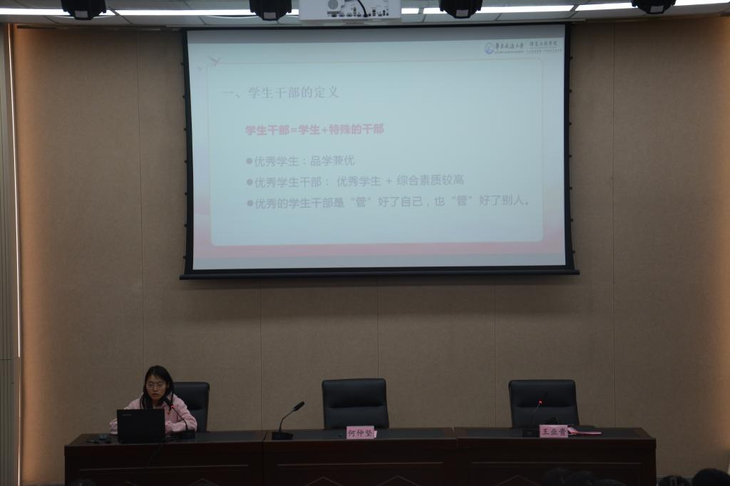 会上谭莉如何成为一名优秀的学生骨干为主题进行交流分享,主要围绕如何正确处理学习与工作的平衡和如何正确对待干部职位的态度两个问题进行发言她提到,学生干部应当通过培养自身政治上能力上团队上的素质更好地平衡学习与工作之间的关系,还应当端正态度做到在工作中积累经验培养自己独立处理事情的能力成为做事高效对事有主见对不足有思考的优秀学生干部