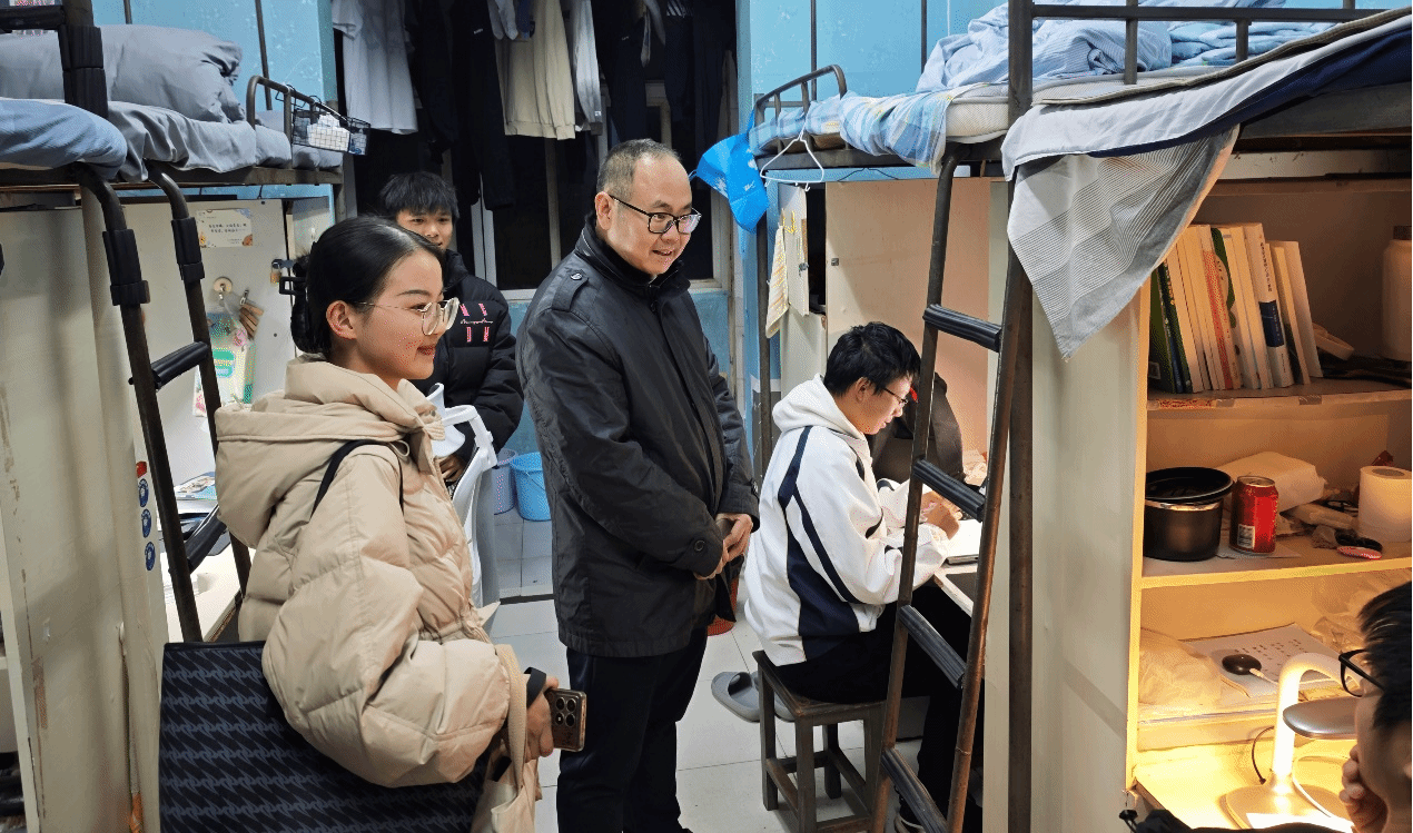 12月10日,冯荣刚一行前往宿舍看望学生,与同学们亲切交流。他叮嘱学生要劳逸结合,做好冬季防寒保暖,增强安全防范意识。