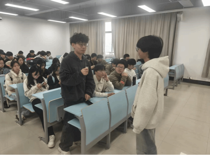现场交流环节,谢志奇同学结合自身理解就片段中的人物动机与情节逻辑提出不同见解,吴轶涛同学与其展开热烈的互动交流。